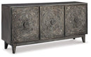 Whether you see squares, triangles or diamonds, you can't help but be captivated by the high-end look and feel of this 3-door accent cabinet. Distinctive elements include inlay pattern touch latch doors made all the more interesting with cross-cut styling. Well equipped with adjustable shelving, this accent cabinet serves your storage needs beautifully.