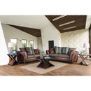 Like contemporary art this sofa set plays with the relationship of color, texture and pattern. The sleek leatherette cups a symphony of chenille cushions and patterned throw pillows that glisten with color and offer the same two textured design. The flared arms seem to overflow and offer up the pillows to inspired and transform the room. This sofa set is the modern centerpiece you have been look for.