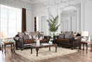 This lavish sofa set has rolled arms highlighted by carved wooden detailing and cabriole legs in a dark finish. The leatherette wrapped frame is offset by soft chenille foam cushions and accent pillows that provide decadent comfort. It's an impeccabl e example of truly memorable, opulent traditional design.