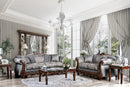A stunning traditional design pairs with some modern flair to make for a beautiful sofa collection that can handle being the centerpiece of your living room. Wooden trim details, round bun feet and carved motifs make for an elevated elegance that add s to the luxury of your room. The seat features a distinct back with split deep tufts and beautifully-patterned fabric.
