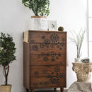 This chest takes a lighthearted artful approach to the rustic bedroom aesthetic. The can't miss floral wood burn branding dotting the entire ensemble playfully contrasts the heavy wooden tones. Dainty round tapered feet put a slight mid-century twist on this piece. Minimal obstruction drawer handles help keep the attention on the patterning. A truly one-of-a-kind bedroom piece.