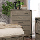 This down to earth bedroom chest is ruggedly built with contrast vibrantly against the hues of the antique gray finish. The crossed planked panels are reminiscent of aged barn doors lending a rich country feel to your home. A felt lined top drawer ad ds extra appeal and functionality.