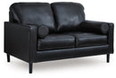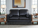 This loveseat embodies timeless mid-century elegance with its linear design, sleek track arms and tapered legs. Skillfully matched leather and faux leather upholstery adds a luxurious touch to the overall look. Experience endless style opportunities for today's living spaces.