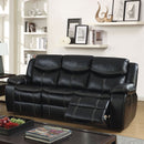 Stretch out your legs and lean back into a comfortable position without having to fight over seats! You and your family can all enjoy reclining functions with this comfortable sofa. Each seat comes upholstered in black leatherette for a cool and rela xing experience. Plush cushions and baseball stitching accents add shape and dimension to your stylish living room!