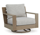 This outdoor swivel lounge chair is just what you need to get your outdoor party started. Though it looks remarkably like wood, its durable frame is perfectly suited for alfresco living. Grab a drink, kick back and swivel all around to take in the view. Wrapped in high-performance Nuvella+™ fabric, the cushions are as plush as they are practical.