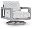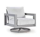 Indulge in luxe outside living without sacrificing longevity. This outdoor swivel chair combines on-trend texture with a sleek aluminum frame. Soak up the sun poolside or on the porch—a 360-degree swivel allows you to effortlessly turn to chat with guests or look after the kids. And with cleanable, UV-resistant Nuvella® fabric in a showstopping corded look, style and durability go hand in hand.