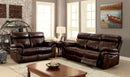 Simplify the family room with a little sleek and shined reclining sofa. Top grain leather match ensures a smooth exterior to enhance the plush cushions within. Reclining seats offer comfort at any hour and the brown coloring is sure to match well wit h any existing d�cor.