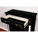 Azha Black Chest, 40"L X 17 5/8"W X 54"H, 184.8lbs. Update lavishly with this stunning bedroom chest. Case goods shine as mirrored accents glimmer against the black finished set. Sculpted accents embellish with floral patterning, completing the set with rich styling. Features: Crystal-like Acrylic Button Tufted 3mm Mirror Trim Inserts Floral Faux Wood Carvings