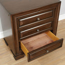Brandt Brown Cherry Night Stand, 26"W X 17"D X 28"H, 57.2lbs. This nightstand offers two solutions at once. It is visually stunning, and has unrivaled storage space to keep your fabulous new room clutter free. With three deep drawers, this nightstand can hold clothes, jewelry, and anything else necessary. The d eep chestnut finish and antique hardware of this piece gives it a subtle elegance. An underlight nightlight gives you enough light to see without waking anyone up. Features: Transitional Brown Cherry Wood, Wood Veneers, Others Storage Bed Wood Inlay Design Felt-lined Top Drawers English Dovetail Drawer Construction Internal USB/Power Outlet Nightlight under Nightstand Insect Deterring Cedar Drawer