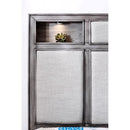 DAPHNE Gray E.King Bed, 87 3/4"L X 81 1/4"W X 58"H, 154.7lbs. In addition to stunning carved details and felt-lined top drawers, this transitional style bedroom collection comes with built-in headboard shelves and convenient touch lights. An extra drawer hides within the nightstand and dresser while the chest o ffers extra functionality with its lift-top jewelry storage, complete with mirror. Sleek silver tone handles sparkle against the weathered gray finish for a beautifully contemporary design that will beautify any bedroom. Features: Transitional Style Padded Fabric Headboard Built-in Touch Light in Headboard Hidden Drawer in Night Stand and Dresser Double Drawer Fronts Felt-lined Top Drawers Solid Wood, Wood Veneer, Others Gray Finish