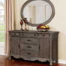 Make the heart of your home a traditionally inspired marvel. This dinning set has everything you need to completely up root the look of your home and create a fine dining experience. Every fine detail has been design to showcase sophistication and a grand sense of class. The curling skirt, the ball and claw feet, even the wire brushed gray finish contribute to a refined air. The ivory upholstered chairs are framed by a foliage motif woodwork that entices you to sit and chat. A gorgeous server table is complimented by a mirror to help light the room and create a sense of unity and completeness.