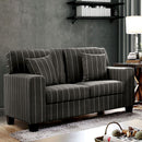 Integrate style and sophistication into your living room with this statement making love seat. Upholstered in a pin striped dark gray, this set adds visual depth and unique personality into your home. Comfortable plush cushions are filled with foam to pad the wood frame within. Wide track arms add breadth to the simple structure, allowing the bold stripes to take center stage. Included throw pillows coordinate and add some fun to this set.