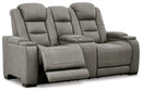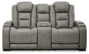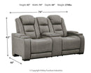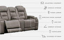 Reserved for him and made for her, this power reclining loveseat in gray delivers all the comfort and style you could ask for. Inspired by sports car interiors, the combination leather and faux leather upholstery has a “perforated automotive” treatment for that much more appeal. Positioned at your fingertips, the advanced one-touch power control puts you in the driver’s seat with everything from an Easy View™ power headrest and power lumbar support, to a USB port and wireless charging for your phone. Talk about fully loaded. And with integrated cup holders and hidden storage compartments under the posh, padded armrests, this designer power reclining loveseat makes the most of every inch of space.