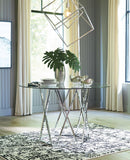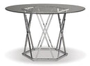 Wowing with an open and airy but sturdy profile, this round dining room table is sure to whet your appetite for ultra-contemporary style. Sporting a chrome-tone finish for a high-sheen effect, the hexagonal metal base is striking from every angle. Clear glass top rounds out the look with sheer simplicity.