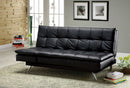 This futon sofa with chrome legs is both functional and stylish. Covered in black leatherette, it quickly converts into a bed, or it can adjust to a full size chaise.