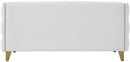 Upholstered in soft white faux leather, this Michelle love seat is sumptuously glamorous. Designed for upscale living, this chair features rich gold nail head trim and gold iron legs that keep it grounded in contemporary beauty. Tufted material covers every inch of this unit, and button tufting ensures that the unit stays plump and comfortable and holds up well to continual use. Pair it with other items in the collection for a cohesive look.