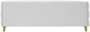 Upholstered in soft white faux leather, this Michelle sofa is sumptuously glamorous. Designed for upscale living, this chair features rich gold nail head trim and gold iron legs that keep it grounded in contemporary beauty. Tufted material covers every inch of this unit, and button tufting ensures that the unit stays plump and comfortable and holds up well to continual use. Pair it with other items in the collection for a cohesive look.
