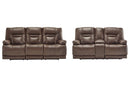 Big and bold, this power reclining sofa, loveseat and recliner package with Easy View™ power adjustable headrests delivers comfort at the touch of a button. Easily recline and position the headrests and lumbar supports to your liking for maximum comfort. Plus, with the convenient USB charging ports, cell phones or laptops can be charged without having to get up. The feel of heavy weight leather surrounds you via the cushioned seat, interior bustled back cushioning and pillow top armrest, while faux leather is on the back and sides for affordability. The effect seen in the umber-colored upholstery creates a rustic look—perfect for your modern or casual setting.