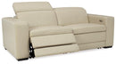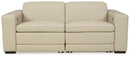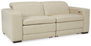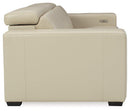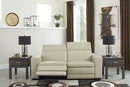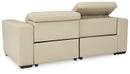 Truly putting high design into recline, this loveseat with gray leather match upholstery proves that just because you're a recliner doesn't mean you have to look like one. Deceptively beautiful, its ultra clean-lined aesthetic is as cool and contemporary as they come. The low-profile back has a super swank look. When you need more support for your head and neck, the press of a button engages the Easy View™ power adjustable headrest, designed to let you lean back and still have a primo view of the TV. To save space, the zero wall design requires minimal space between wall and chair back. Indulgent pillow top seating gives an added layer of comfort.