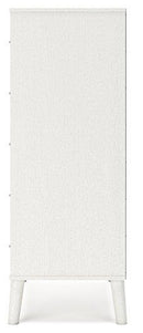 Dare to take minimalism to the max. This chest of drawers has an air of sleek simplicity thanks to its white painted finish with subtle replicated wood grain. Magnificently mod splay legs are a compelling complement to the streamlined design. And with two sets of faux leather drawer pulls that allow you to customize the chest to suit your space, there's no doubt about it: This contemporary piece is sure to become a classic.