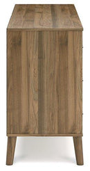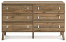 Dare to take minimalism to the max. This dresser has an air of sleek simplicity thanks to its white painted finish with subtle replicated wood grain. The magnificently mod splay legs are a compelling complement to its streamlined design. And with two sets of faux leather drawer pulls that allow you to customize the dresser to suit your space, there's no doubt about it: This contemporary piece is sure to become a classic.