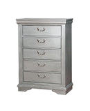 Elegant carvings and distinguished antique handles are glamorously paired with a Silver Gray finish to create this stunningly luxurious design. Decorative nailhead trim adds luxurious detail, accentuating the silver tone handles and spacious drawers.