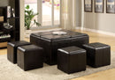 Accent any living area with this multi-functional storage ottoman. Four individual cubes can be removed and used for extra seating, and each comes with a built-in tray. Top can be used as trays. Upholstered in espresso leatherette.