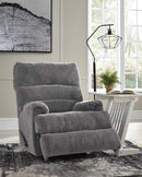 Roll out a cool look for your man cave or femme den with this indulgent recliner. Waterfall cushioning on the high chair back is paired with a double-roll footrest for a high-style aesthetic that cradles you in comfort from head to toe. Tweed-weave neutral upholstery is decadently soft and loaded with texture.