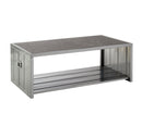 At the heart of industrial designs is a need to make form and function one and the same. A simple box shape gives you open bottom shelving. Two metal handles make for accents but also assist for easy movement and rearranging of this coffee table.