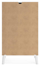 The perfect marriage of contemporary and casual style, this chest of drawers is a charming addition to your home. It's expressive with a two-tone look in a solid matte white finish and a replicated sugarberry wood grain pattern. Ball-bearing glides offer smooth opening and closing of the drawers, while white knobs and splay legs add a finishing touch.