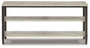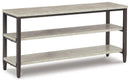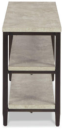 With its casual, linear style design, this spacious sofa table works wonderfully well with larger sofas and sectionals. You'll easily make use of the handy open storage that the two shelves have to offer. Features faux concrete melamine top with metal base in a aged bronze-tone finish.