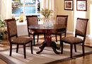 A perfect table and chairs for a small kitchen nook or dining room. This round pedestal table has simple yet elegant lines. Four matching chairs are upholstered in a neutral fabric that will blend with any decor. Finished in antique cherry.