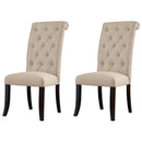 This arrives at the table with the full scale comfort of a favorite living room chair. Classic tufting dresses up the high, beautifully curved back. Both seat and back are firmly cushioned and covered in a textured upholstery.