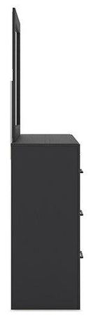 Relaxed yet striking, this dresser and mirror set brings casual beauty and function to your dream destination. The dresser's delightful two-tone treatment blends a fresh replicated walnut grain with a matte black finish. You'll look fabulous in the unadorned simplicity of the mirror, which lends a contemporary touch while you dress for work or play.