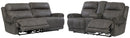 Sparing that "puffy" look you might expect from a recliner, this reclining sofa and loveseat set doesn't hold back when it comes to contemporary style. Subtle touches such as sporty jumbo stitching, nailhead trim and a "weather worn" effect on the upholstery give this handsome set a buttoned-up appeal and fresh feel. Loveseat’s center console with dual cup holders brings a handy element to the arrangement.